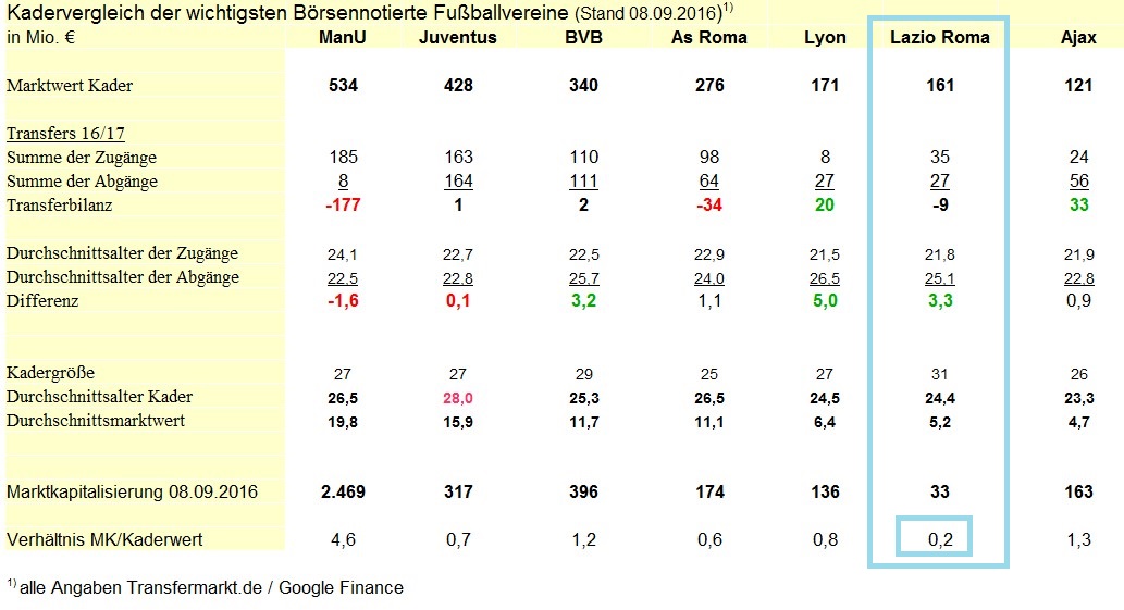AS Rom ist einerseits deutlich höher bewertet (EV 5x höher als bei Lazio) andererseits wegen der Stadionbau wo ein riesiges Investment bevorstehe allerdings arg kompliziert... sehe meine Ausführungen dazu im Roma Forum.