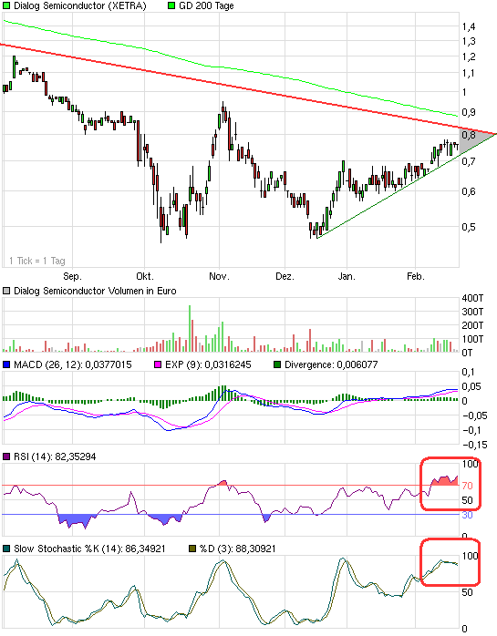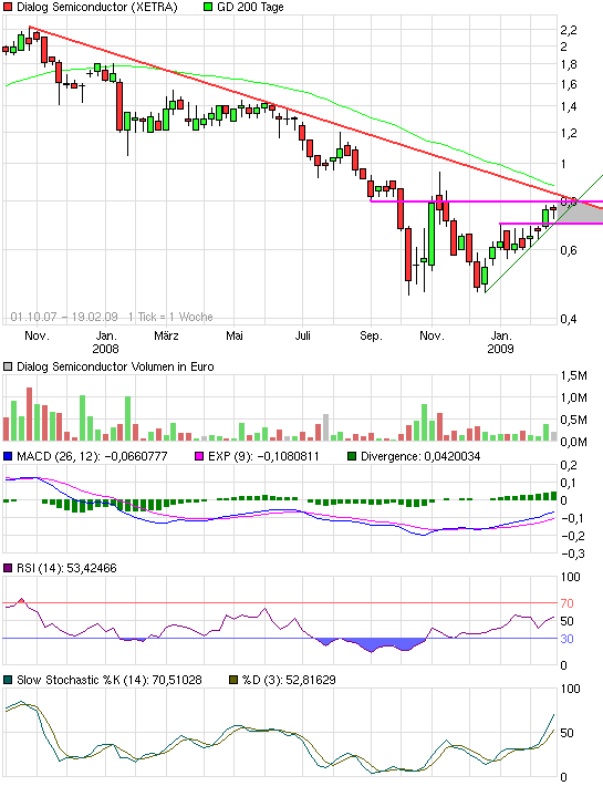 Hier mal nen Chart. Hat sich noch nicht viel verändert. Im mittelfristigen Zeitraum sehen die Indikatoren ziemlich gut aus und lassen noch Potenzial nach oben offen. Allerdings warten da Abwärtstrend und 200-Tage-Linie. Aufgrund der kurzfristig überkauften Indikatoren erwarte ich daher rein charttechnisch eine Seitwärtsbewegung zwischen 0,70 und 0,83 € in den nächsten 3-6 Wochen, bevor eine Entscheidung fallen wird.