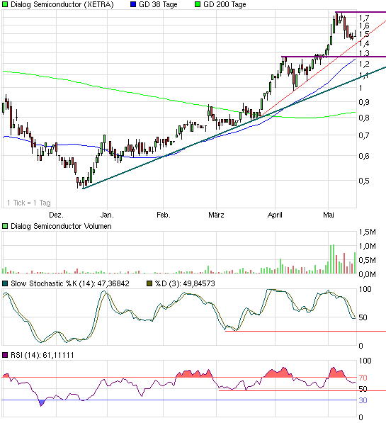 für einen zweiten einstieg in die aktie,die kurse werden nach den positiven firmenmeldungen richtung 2 euro steigen,die konsolidierung ist meiner meinung zu heftig ausgefallen,das potenzial der aktie ist sehr hoch grössere investoren werden sich wieder billig einkaufen können,ich rechne in den nächsten tagen mit einem heftigen anstieg der kurse ,sehr gute aussichten für Q2 ich rechne mit einem umsatz von 40 mill. die auftragseingänge im chipbereich haben sich mehrheitlich verbessert,die nachfrage steigt langsam wieder an,die lager haben sich gut abgebaut.