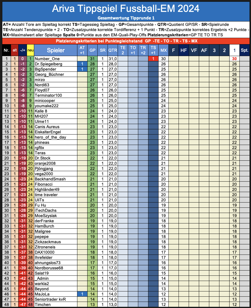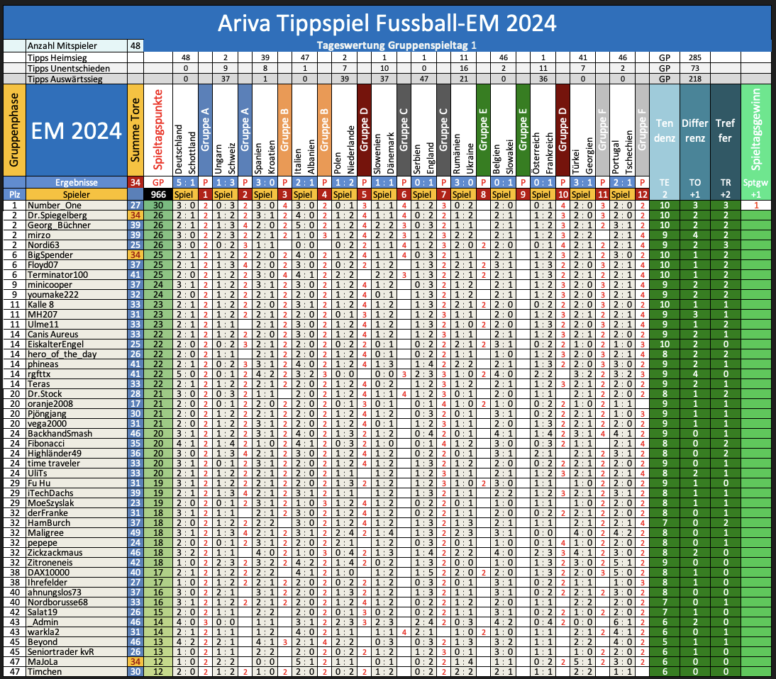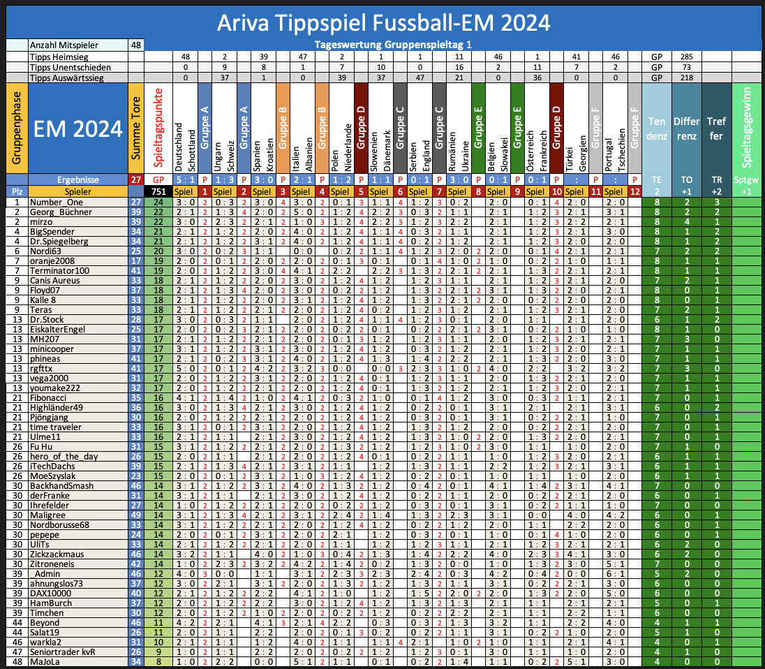 Tipprunde 1 Ariva Tippspiel EM 2024 Spieltag 1