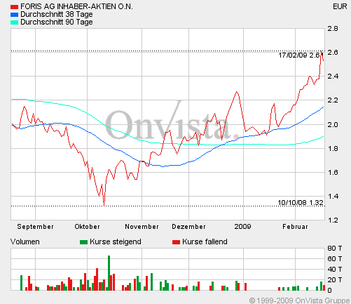 Tatsächlich hielt sich der im General Standard der Frankfurter Wertpapierbörse notierte Titel mit diesem Kursplus angesichts des schwierigen Börsenumfeldes ziemlich gut. So büßte der deutsche Leitindex Dax im gleichen Zeitraum über 20 Prozent ein. Auch heute kann die Foris-Aktie mit einem Kursplus von bis zu zehn Prozent auf 2,17 Euro die maue Kursentwicklung beim Dax mehr als toppen und setzt sich sogar an die Spitze des CDax.