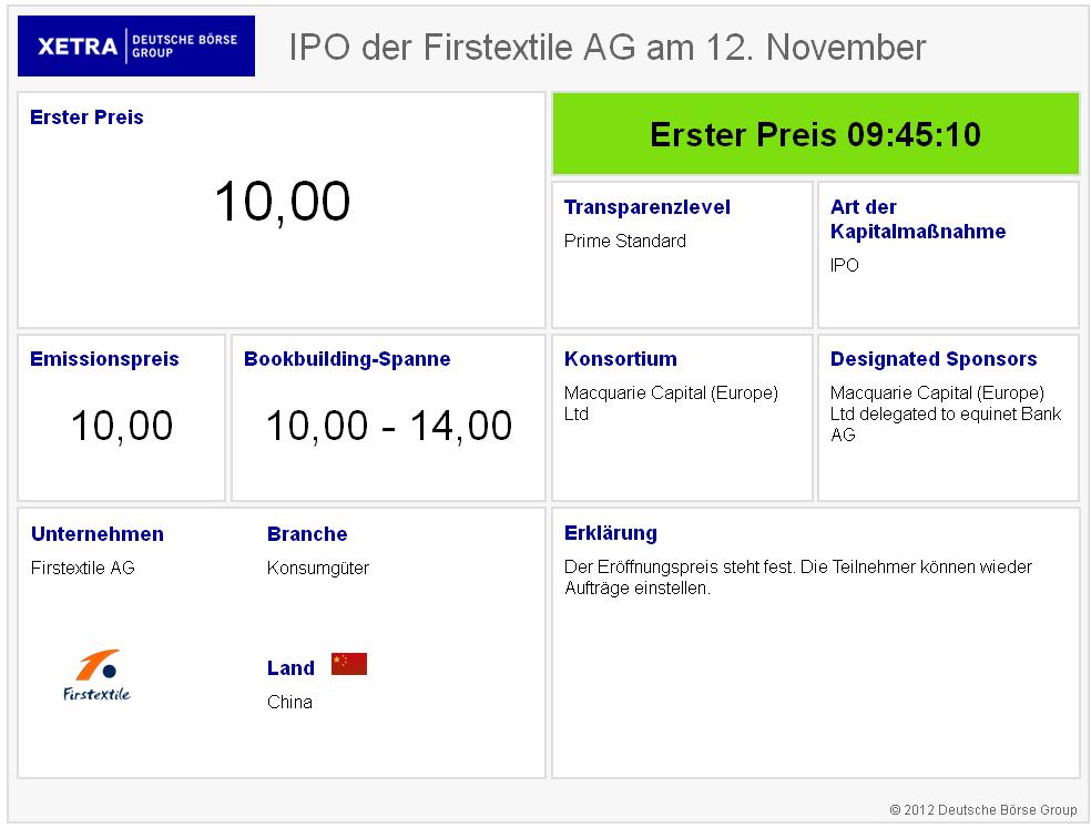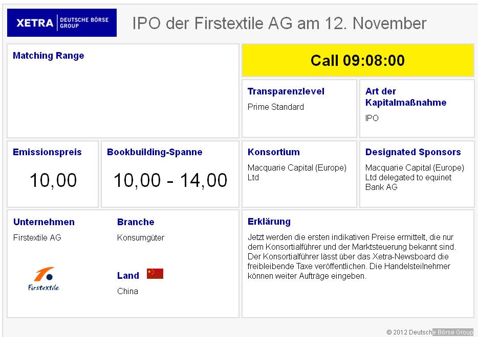 Am 9. November soll die Erstnotiz von Firstextile im Prime Standard in Frankfurt erfolgen. Der Börsengang des chinesischen Herstellers von garngefärbten Stoffen richtet sich vor allem an institutionelle Anleger in Europa. Die Gesellschaft machte 2011 einen Umsatz von 131,7 Millionen Euro. In den ersten sechs Monaten des laufenden Jahres generiert die Gesellschaft einen Umsatz von 79,5 Millionen Euro.