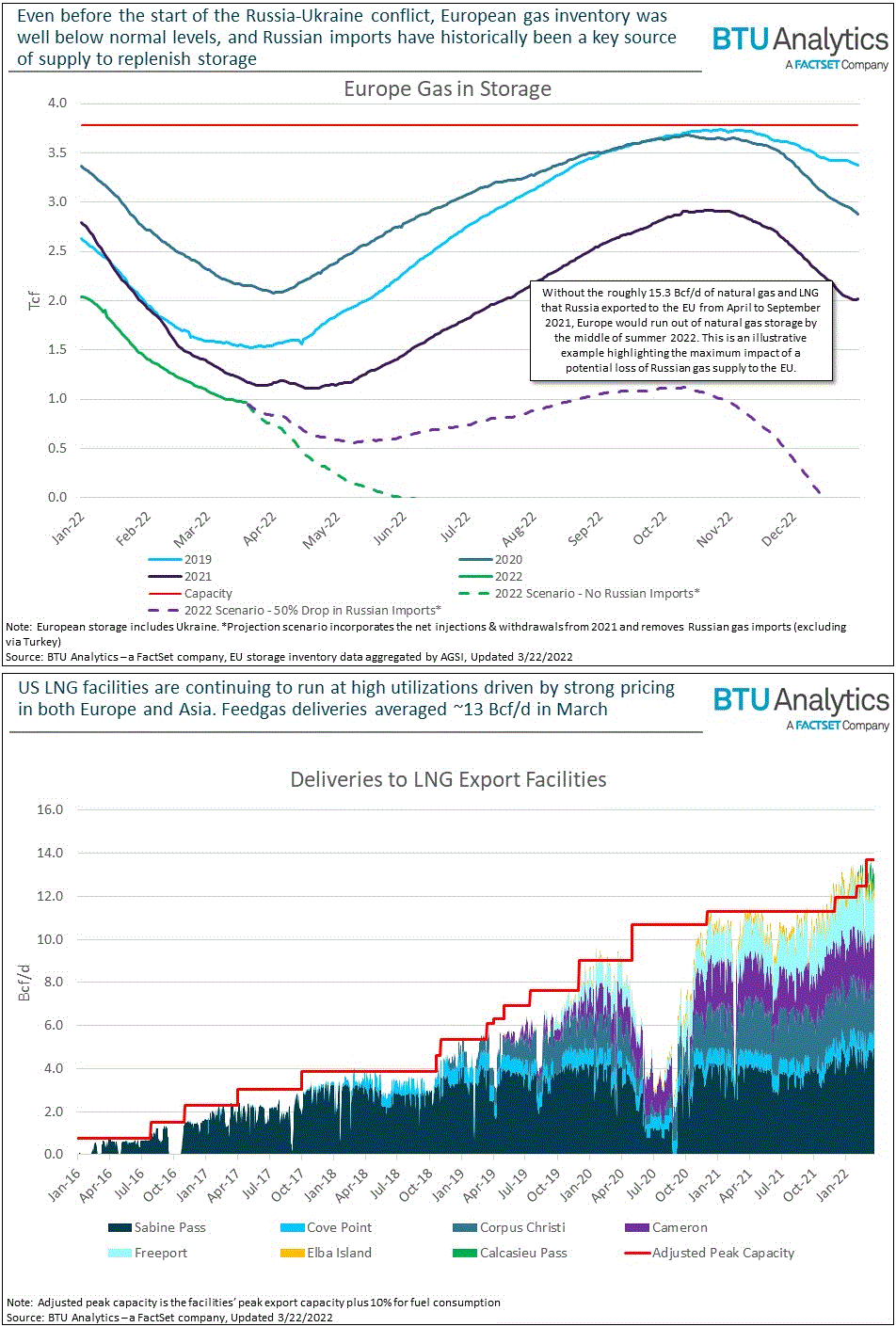 Gleichzeitig ist es wichtig zu bedenken, dass Europa nicht die einzige Region mit geringen Erdgasvorräten ist. Die Erdgasspeicherung ist weltweit gering, wie der Anstieg der globalen LNG-Preise zeigt, lange bevor der Russland-Ukraine-Konflikt Schlagzeilen machte. Aufgrund dieser globalen Engpässe schätzt BTU Analytics, dass 1,3 Bcf/d der weltweiten LNG-Versorgung ohne größere Preiserhöhungen nach Europa verlagert werden könnten, da die EU im Jahr 2021 durchschnittlich 1,3 Bcf/d russisches LNG importierte, das an andere Orte geliefert werden könnte .