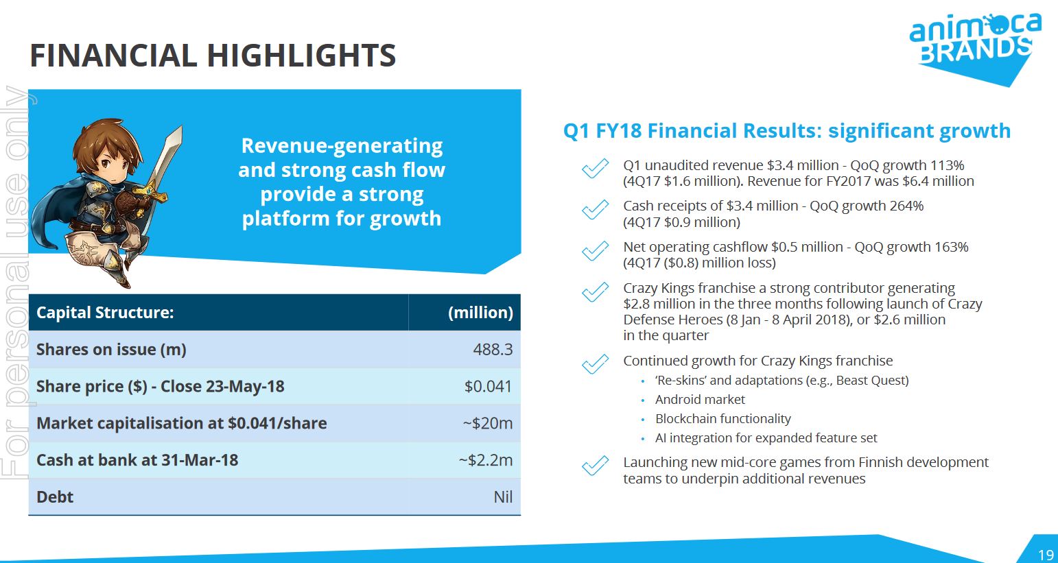 Und auch die weiteren Pläne der Firma sehen äußerst vielversprechend aus. Zum Beispiel werden die sehr erfolgreichen Smartphone Spiele, die auf dem Apple schon für Millionenumsatz gesorgt haben demnächst auf den Android Handys veröffentlicht wie Samsung und Sony.