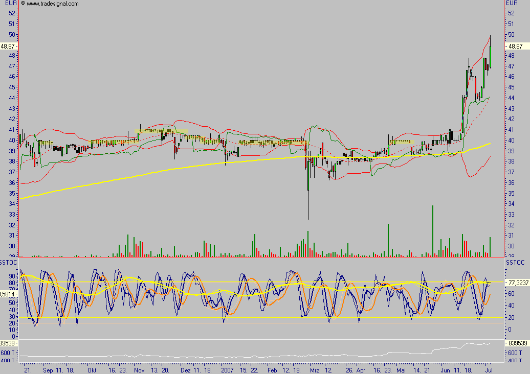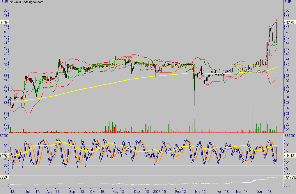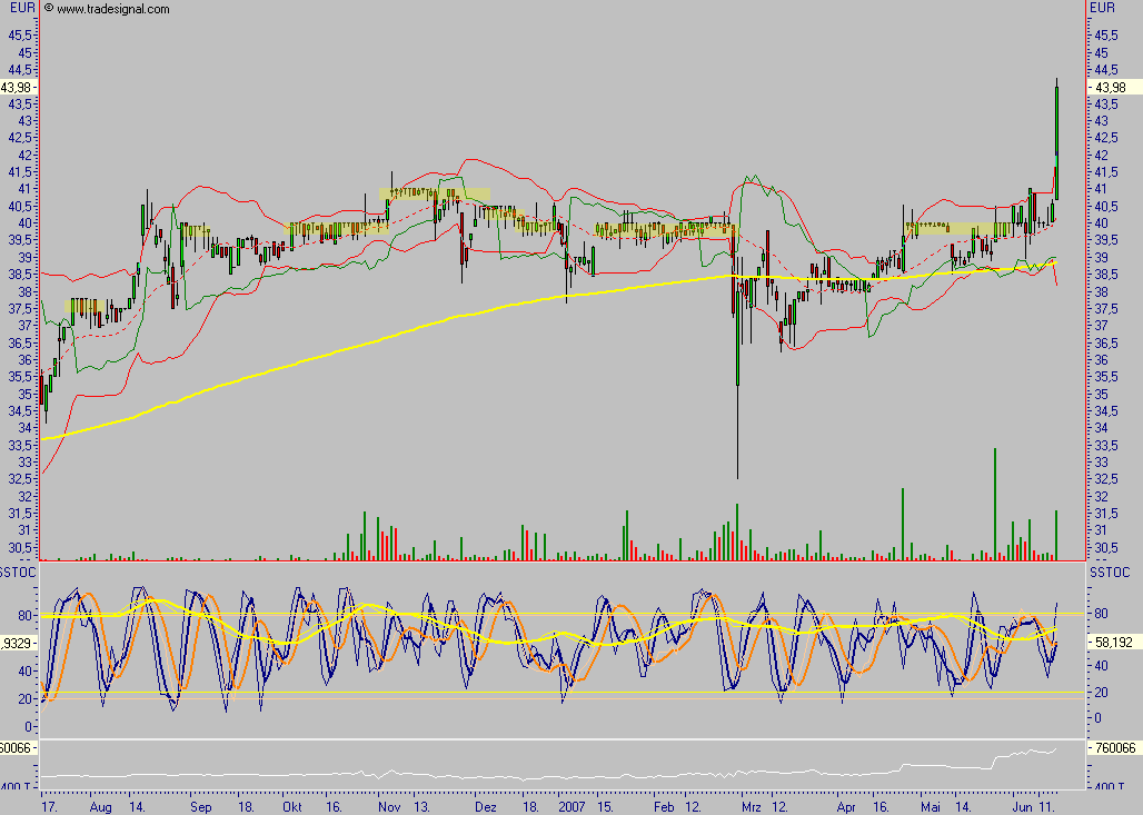 Schlusskurs am Freitag war 40,70 Euro. Mein Stopp/Loss Kurs sind 38 Euro.