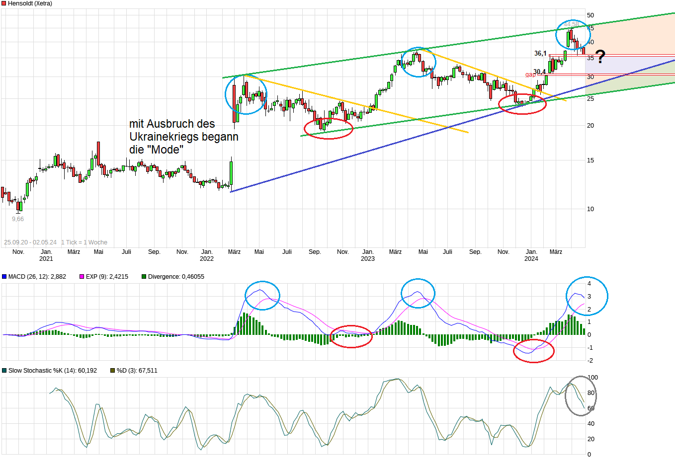 Aktuell ist man im Unterstützungsbereich um 35,75/36,10 angekommen. Wenn der Bereich auch noch fällt, dann könnte eine weitere Welle anlaufen. Also ich sehe hier ebenfalls eine klare Überkauftheit die sich noch weiter abbauen sollte in einer Konsolidierung. Man schaue im Wochenchart auf den stark überkauften MACD und wie sich in der Vergangenheit der Chart im Anschluß verhalten hat bei abdrehen des Indikators nach unten, Stochastik ist ebenfalls fallend und kommt aus dem überkauften Bereich. Die Kurse sind der realen fundamentalen Entwicklung etwas enteilt, was bei solchen "Modeaktien" ja immer wieder passiert. Die ganzen Rüstungsaktien sind ja wie verrückt gestiegen mit Beginn des Ukraine-Kriegs. Da haben die täglichen Bilder in den Medien das Ganze immer weiter emotional hochgekocht, ähnlich wie damals bei Corona. Kaum war Corona vorbei, waren auch bestimmte "Mode" Aktien dann nicht mehr "hot". Dieser Krieg scheint ja nun doch langsam in die Endphase zu gehen, weil erwartungsgemäß der Zwerg auf Strecke nicht den Riesen schlagen kann. Viele leere Unterstützungsworte und Krokodilstränen der westlichen Politiker reichen eben nicht. Der Westen will lieber endlich Ruhe an dieser Front, aus eigennützigen wirtschaftlichen Interessen, aber sagt es eben nicht offen. Damit könnte sich perspektivisch auch das Interesse an diesen Modeaktien wieder abkühlen und vielleicht andere Branchen dafür wieder mehr in den Fokus kommen.