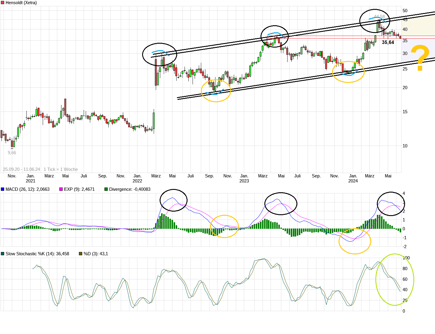 Angesichts der Indikatoren-Konstellation ist der momentane Chartverlauf nicht ganz überraschend. Man hat ja ähnliche Konstellationen zuvor schon mehrfach gehabt. Man betrachtet dafür den Wochenkerzen-Chart und speziell die Indikatoren MACD und Slow Stochastik. Letzteres gibt schon etwas eher die Umkehr an, wenn man sich in einer extrem überkauften Situation befindet und der MACD ist von seiner Definition her eben etwas nachlaufend. Ich hatte schon vor einiger Zeit geschrieben, daß sich hier wieder eine stark überkaufte Situation im Chart aufgebaut hat die klar nach einer Konsolidierung ruft. Jetzt hat der MACD jüngst ebenfalls seinen Trigger nach unten gekreuzt und damit ein zusätzliches technisches Verkaufssignal generiert. bzw. erstmal einen Trendwechsel bestätigt ( https://www.cmcmarkets.com/de-de/hilfe/glossar/m/macd-indikator ). Wenn es jetzt wieder so ablaufen sollte wie zuvor, dann dürfte sich diese laufende Konsolidierung wohl über weitere Monate jetzt erstmal hinziehen und es dabei auch wohl nochmal Kurse geben deutlich unter der 36er Region. Von daher haben vorsichtige Gemüter mit CT- Ansatz wohl schon verkauft als der Stochi im deutlich überkauften Bereich nach unten gedreht hatte. Und vorsichtige Gemüter dürften wohl auch erst wieder an kaufen denken, wenn die Indikatoren sich wieder hinreichend "abgekühlt" haben. Hensoldt schreibt faktisch rote Zahlen ( 07.05.2024 Hensoldt schreibt trotz Rüstungsboom erneut rote Zahlen https://www.ariva.de/news/...t-trotz-rstungsboom-erneut-rote-11237342 ), hat aber schon eine sehr hohe Bewertung. Das ist auf Strecke keine gesunde Kombination. Da Rüstungswerte vor ca. zwei Jahre als Modeaktien kollektiv hochgeflogen sind nach Beginn des Ukrainekonflikts , hat man danach länger nicht hinreichend auf die Bewertung noch geachtet und eher die Kurse emotional getrieben zu weit steigen lassen. Auch das ist, wie jede Mode, kein Sache die dauerhaft funktioniert, da es umgekehrt bei einem vielleicht doch näherrückenden Waffenstillstand in der Ukraine, dann wieder zu emotional übertriebenen Verkäufen führen könnte. ( https://www.n-tv.de/politik/...-Waffenstillstand-article24902233.html ). Von daher mal schauen was sich politisch diesbezüglich die nächsten Monate dann vielleicht weiterentwickelt.