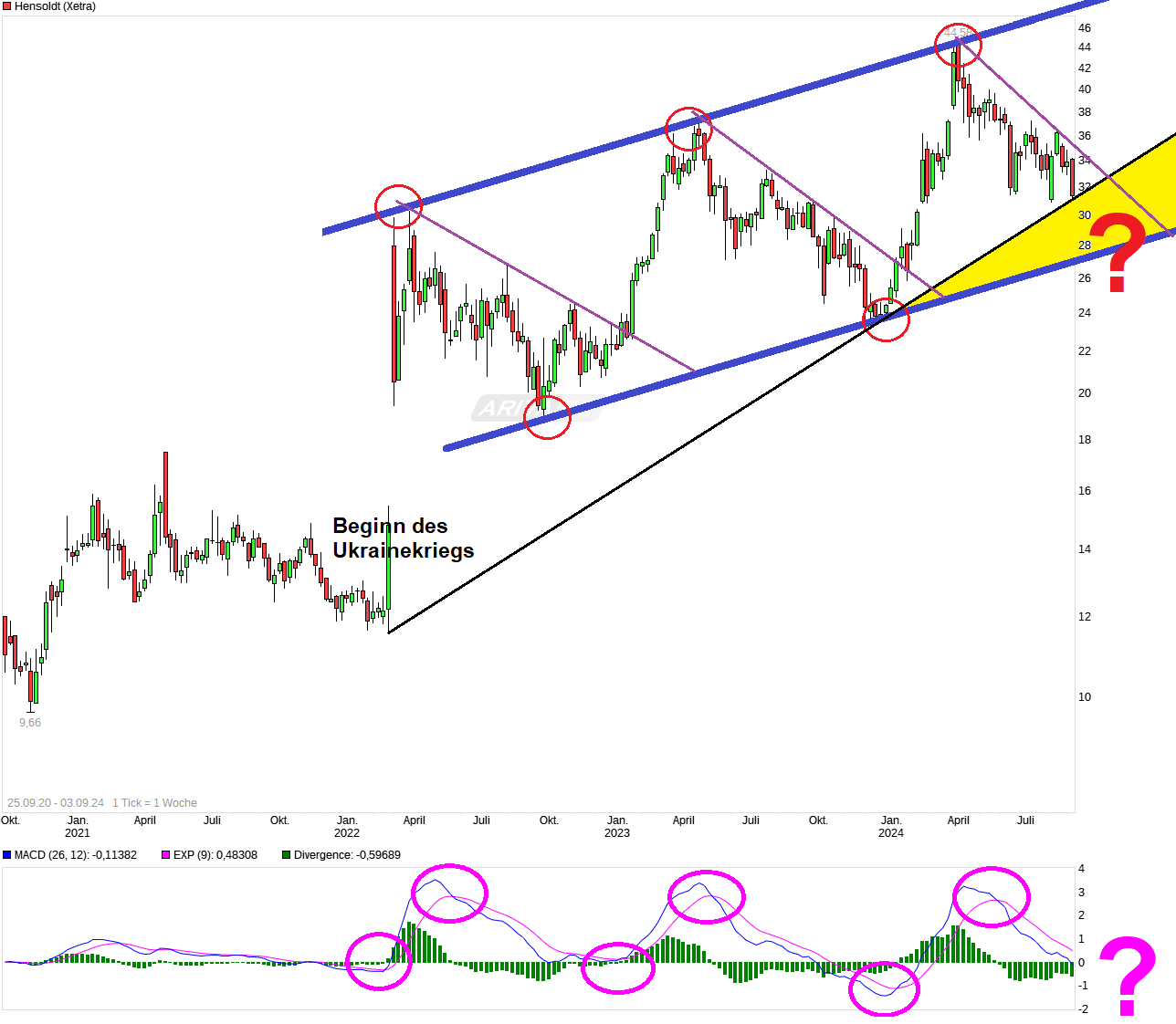 Ich hatte schon länger angemahnt, daß diese ganze emotionale Mode-Blase der Rüstungswerte keinen hinreichenden fundamentalen Unterbau für diese luftigen Kurse hatte und die Kurse viel zu weit nach oben enteilt waren. Hensoldt flog im allgemeinen Emo-Schub klar über 40€ bei der Aktie ohne auch nur einen Cent zu verdienen, sondern mit Verlusten im Konzerbilanz-Gepäck. Der Beginn dieser Blase liegt ja unbestreitbar im Beginn des Ukraine -Krieges. Entsprechend würde das ganze Mode-Produkt eben zurück"schrumpfen" je näher ein Ende des Krieges/ ein Waffenstillstand in der Ukraine rückt und damit der Auslöser der Blase erst einmal wieder aus dem Fokus wäre. Wie ich schon vor längerer Zeit gepostet hatte, so bleibe ich bei meiner Meinung man sollte weiter auf den MACD achten und abwarten bis der wieder ein klares technisches Kaufsignal erzeugt bzw. der Trigger nach oben kreuzt.