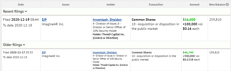 Der Vorsitzende der Geschäftsleitung von ImagineAR hat sich letzte Woche 400k Stück ins Depot gelegt.