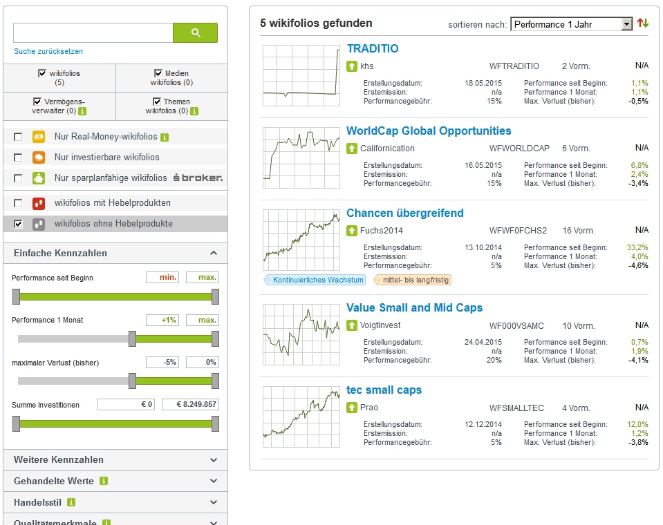 Ich habe mich mal mit der Suchfunktion von Wikifolio mit vielen verschiedenen Einstellungen über das Angobot orientiert. Dabei habe ich viele Erstaunliches und auch Fragwürdiges entdeckt. Teilweise möchte ich das hier darstellen.