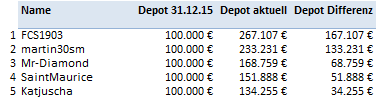 Das Spitzefeld ist dasselbe geblieben, lediglich Katjuscha hat sich auf Platz 3 vorgeschoben und Mr-Diamond und SaintMaurice auf Platz 4 bzw. 5 verschoben. Die Steigerung über alle Depots ist von 10% am 31.12.2016 auf nunmehr 18% gestieben.