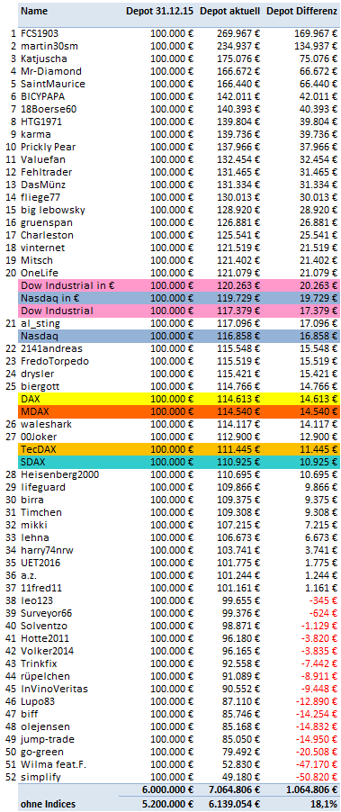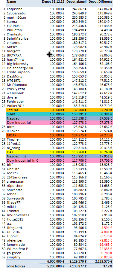 na ja, mein Ziel ist es in jedem Jahr unter die Top10 zu kommen. Insofern kann ich unterm Strich wieder zufrieden sein. Hoffe aber in 2017 auf ein ausgeglicheneres Depot. Deshalb hab ich auch eher etwas größere, konservativere Aktien für dieses Jahr ausgewählt.