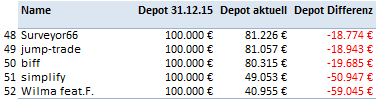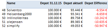 Startkapital ist 100.000 EUR. Der am 30.12.2015 veröffentlichte Schlusskurs macht den Einstiegskurs. Es wird jeweils der Tagesschlusskurs von Yahoo Finance zu den Aktualisierungen verwendet.
