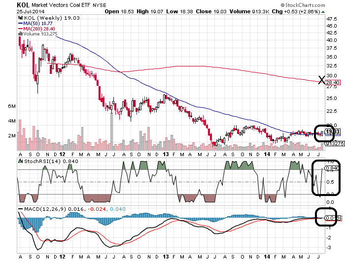 Mal eine gute Nachricht... KOL = Merket Vektor Coal ETF.....sieht auf Wochensicht im bullischen Modus aus....,Über MA50 notierend, StochRSI gerad in den Kaufbereich durchdrungen und dürfte ein paar Wochen anhalten....