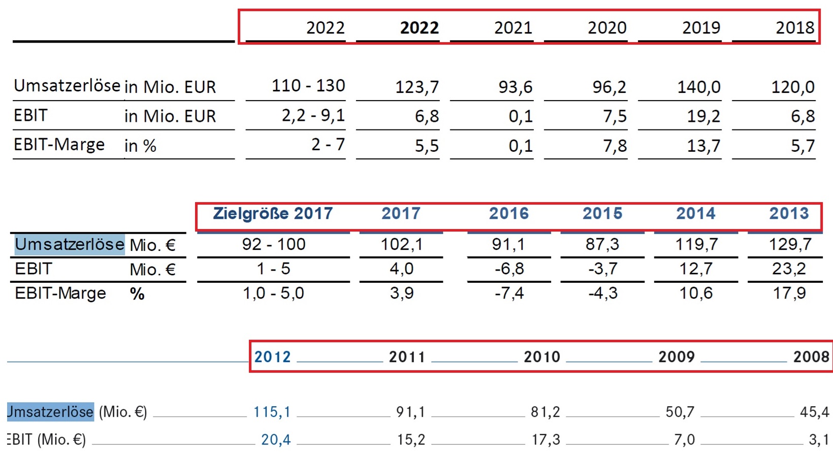 Die EBIT-Marge sollte 2014 zwischen 15 und 17 % liegen. Daraus ergibt sich planerisch ein EBIT zwischen € 19 Mio. und € 24 Mio