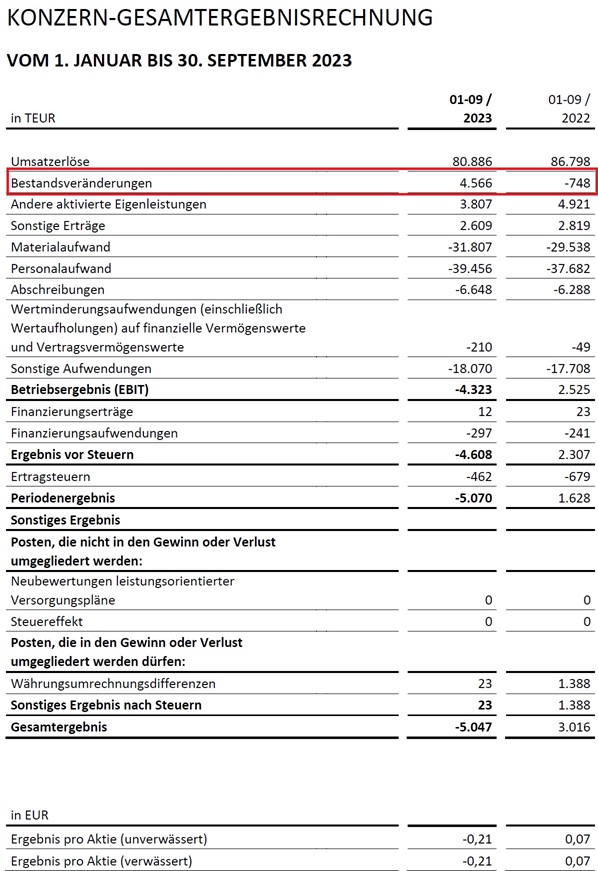 Sowohl in den 9 Monatszahlen als auch in Q3 wurden die Zuwächse nicht mit gesteigertem Umsatz erzielt sondern durch Bestandsveränderung, was bedeutet, dass die positiven Zahlen auf einer Aufwertung von ehemals abgewerteten Vorräten beruht. In Q3 beruht die Hälfte des Betriebsergebnisses ausschließlich auf der Aufwertung der Vorräte.
