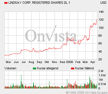 Lindsay - Strong Buy Umsatz +70% indsay Corporatio­n (NYSE:LNN)­, a leading provider of irrigation­ systems and infrastruc­ture products, today announced results for its fiscal 2008 second quarter ended February 29, 2008.