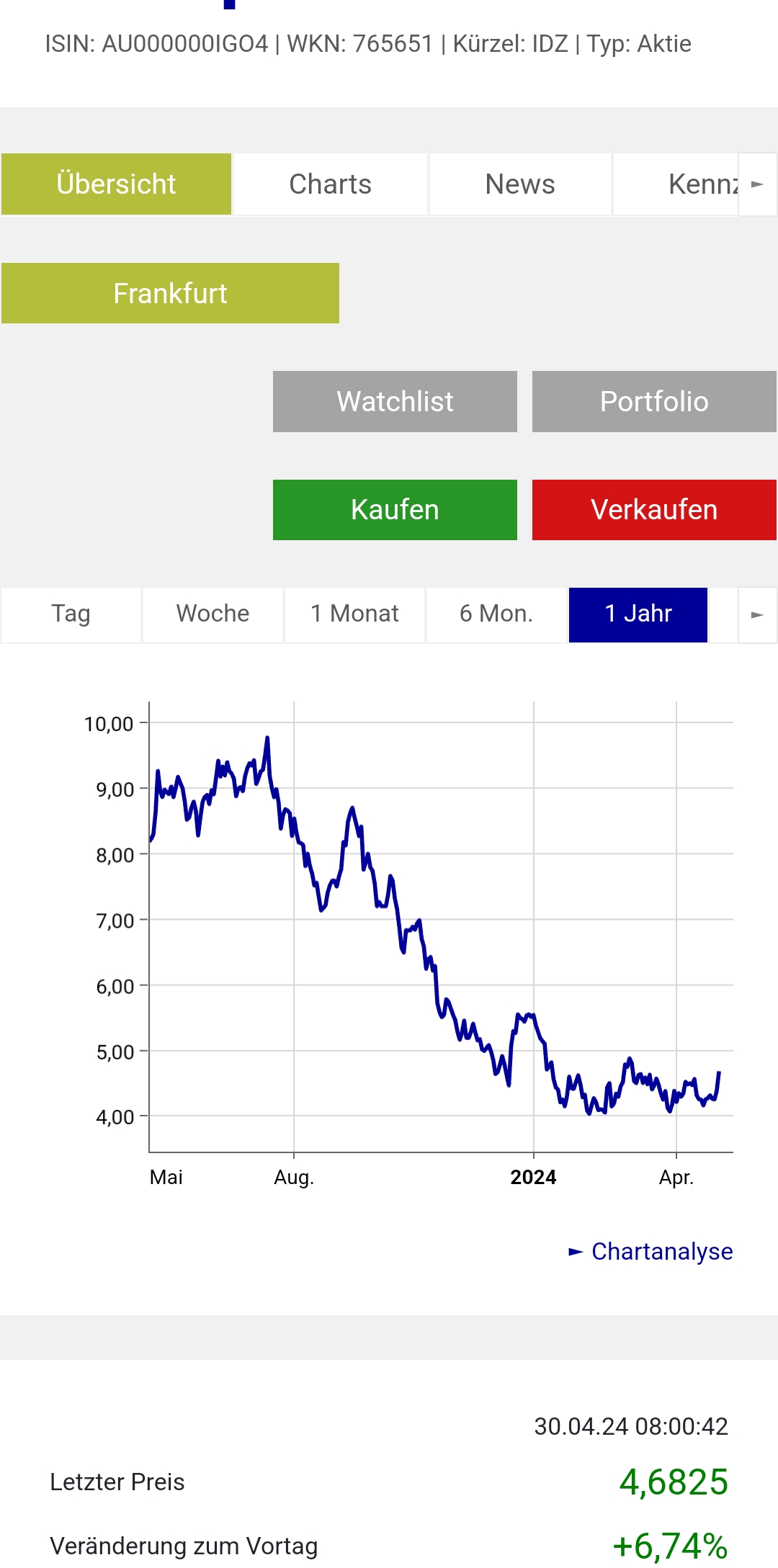 es wurde 1. Tranche IGO eingebucht, als neue Metallbude, nachdem Anglo verkloppt wurde. Habe noch ein Abstauberlimit bei 4,01€. Es ist eine interessante Aussiebude mit gesunden Finanzen die in den letzten Monaten etwas Pech hatte. ; )