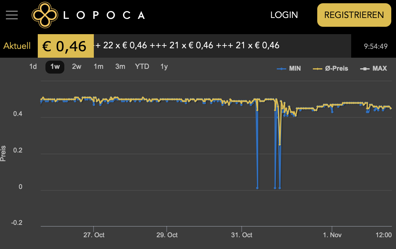 Daher gilt auch nach Jahren das Fazit: Nichts mehr los bei Lopoca. Nugget-Game auch seit Jahren weiter im Keller bei 0,28 €. Der Höchstwert 2024 lag bei nur 0,60 € und damit noch meilenweit davon entfernt, eine nennenswerte Zahl der Spieler in eine gefühlte oder faktische Gewinnzone zu bringen.