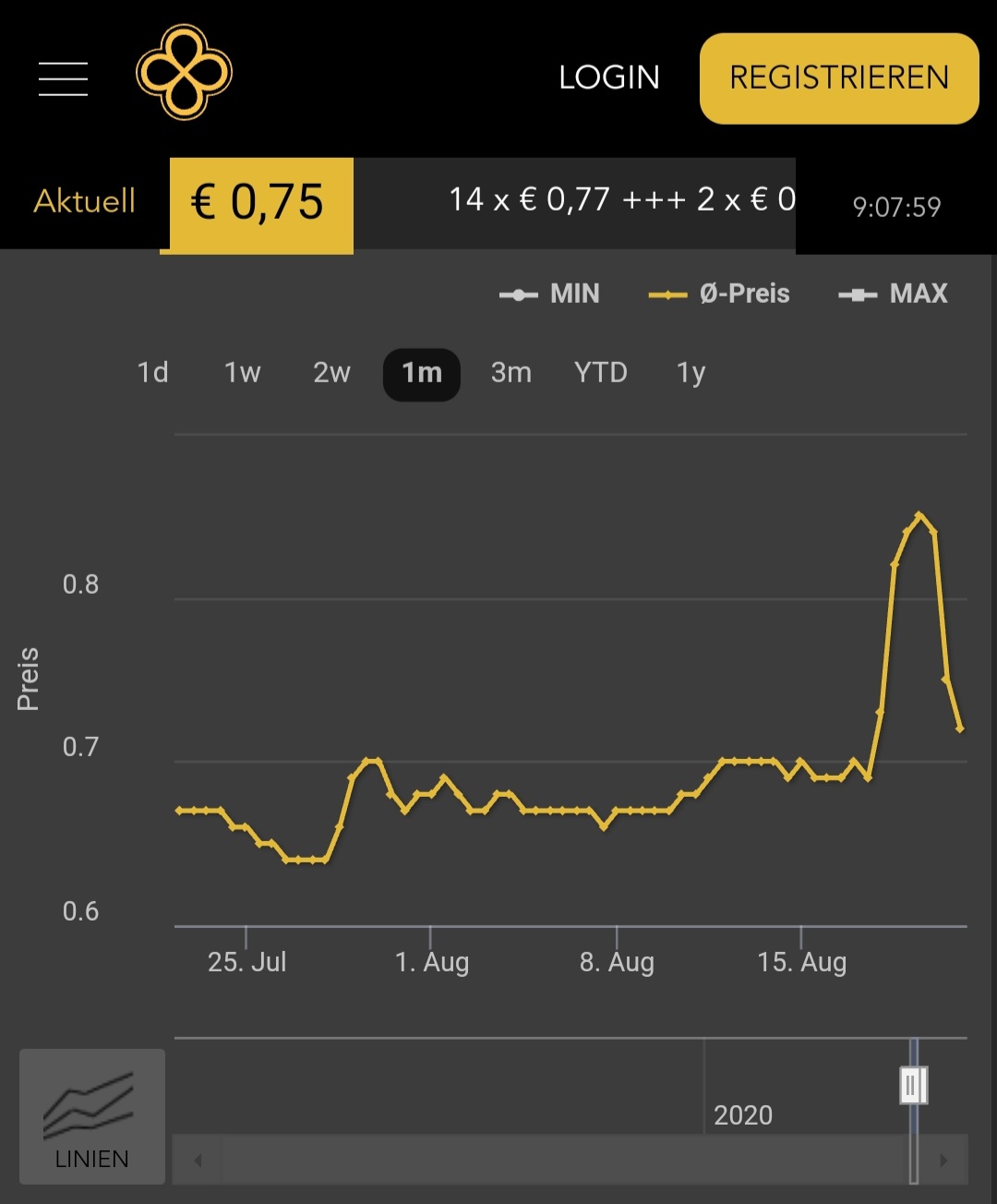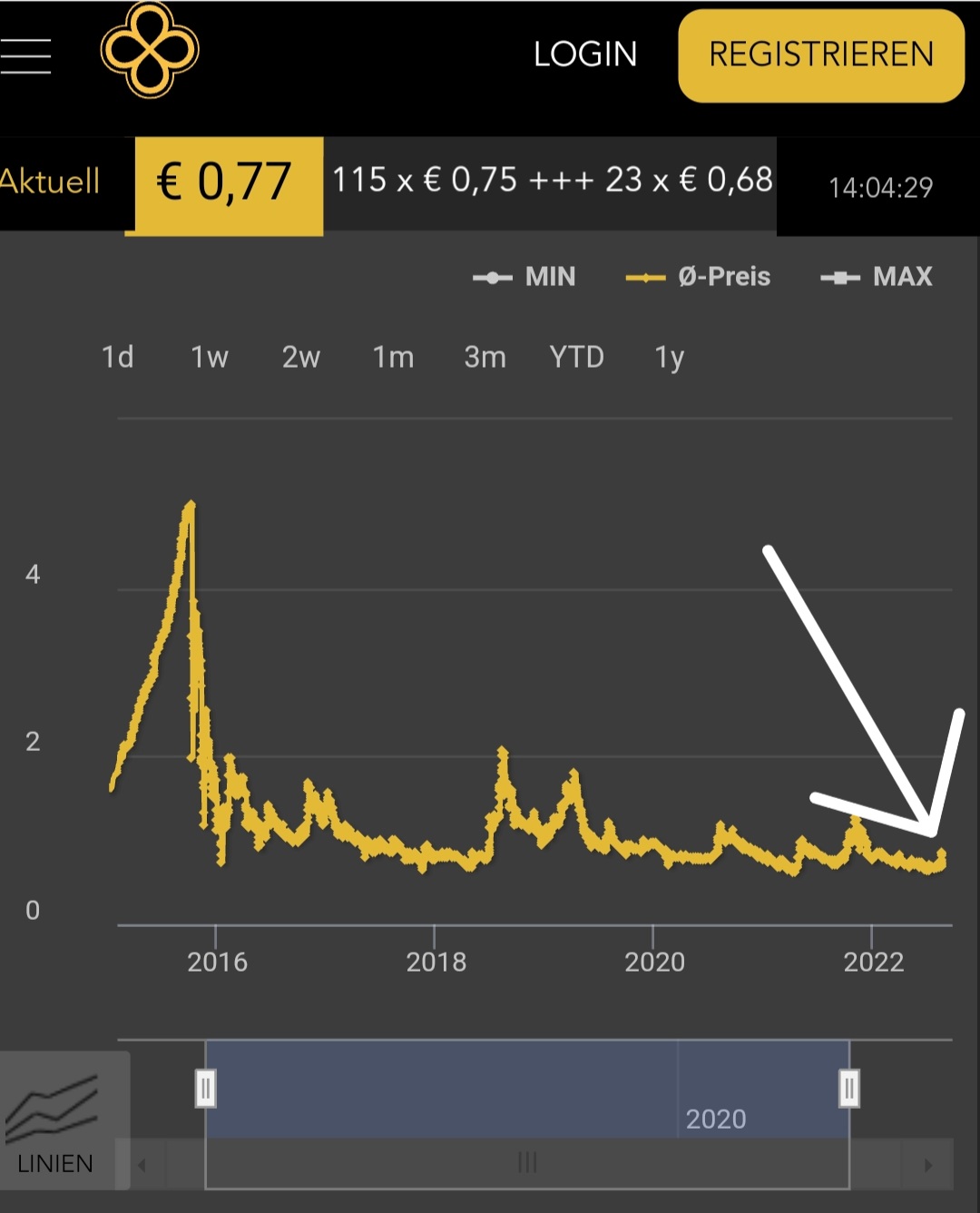 Um Punkt 12uhr und dann nochmals um 17Uhr ging der Preis kurzzeitig auf 0,01€ runter. Leider viel zu kurz um hier nochmals schnell "günstig nachzukaufen". Aber die aktuellen 0,43€ sind weiterhin ein guter Einstiegpreis so kurz vor einem schwindelerregenden Aufstieg der ja unweigerlich kommen muss *hahaha*