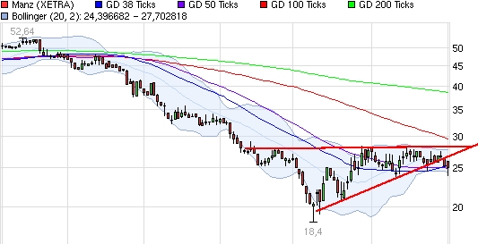 Im August, welch Überraschung, markierte die Aktie ihr Tief bei 18,40 Euro und stieg daraufhin bis zum Zwischenhoch von 28,25 Euro. Dem folgend setzte die Aktie abermals zurück und fand bei 21,20 Euro einen Boden. Aktuell attackiert die Aktie die seit dem Frühjahreshoch etablierte Abwärtstrendlinie.