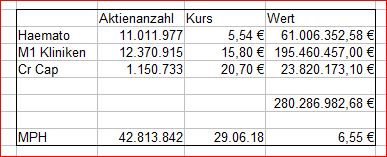 Die Zahlen von Haemato sind nicht schlecht könnte bedeuten das vieleicht die Dividende auf 35 cent für 2018 erhöt wird. Bin mal auf Montag gespannt was M1 Kliniken im Zwischenbericht bekannt gibt, denke wird auch sehr gut ausfallen. Wenn das so ist dürfte es sehr schnell bei MPH wieder nach oben gehen.