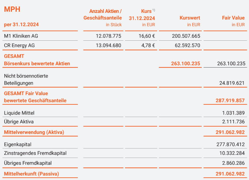 Wir werden hoffentlich mehr über die Zusammensetzung des MPH-Portfolios erfahren (Höhe der Anteile an M1 Kliniken AG and CR Energy AG).