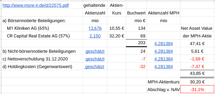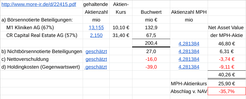 ... der MPH HEALTH CARE AG liegt bei ca. 35-40 EUR/Aktie, weil er zu fast 90% aus börsennotierten beteiligungen (M1 Kliniken AG und CR Capital AG) besteht, die im fall einer liquidation (auflösung) der MPH leicht zu den derzeitigen börsenkursen veräußert werden könnten