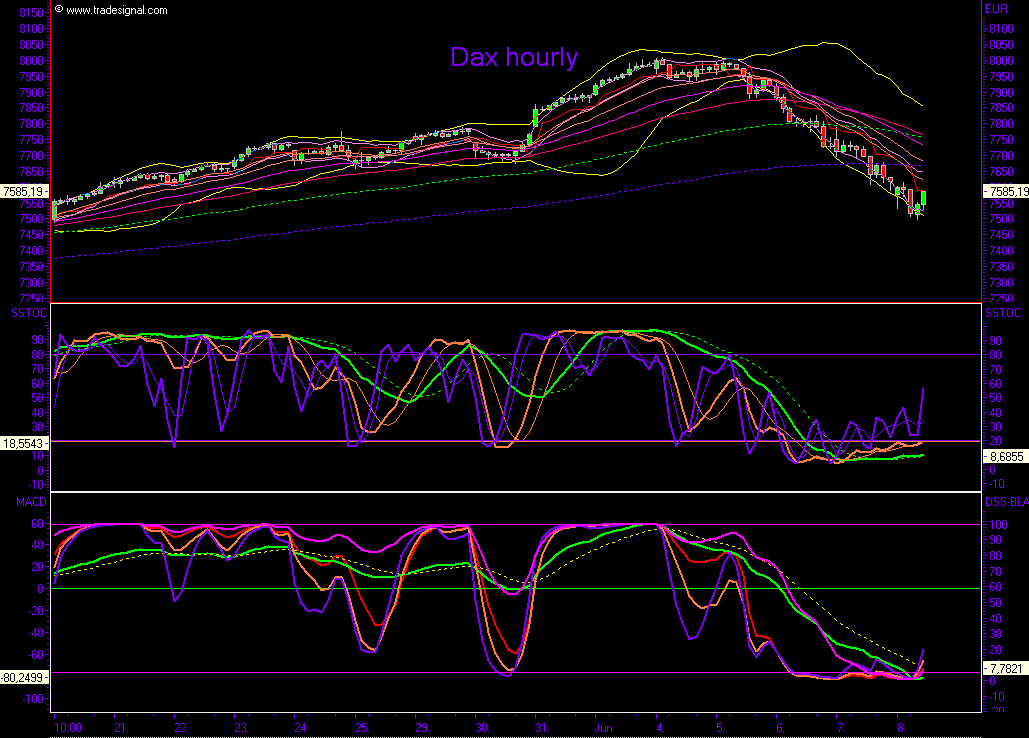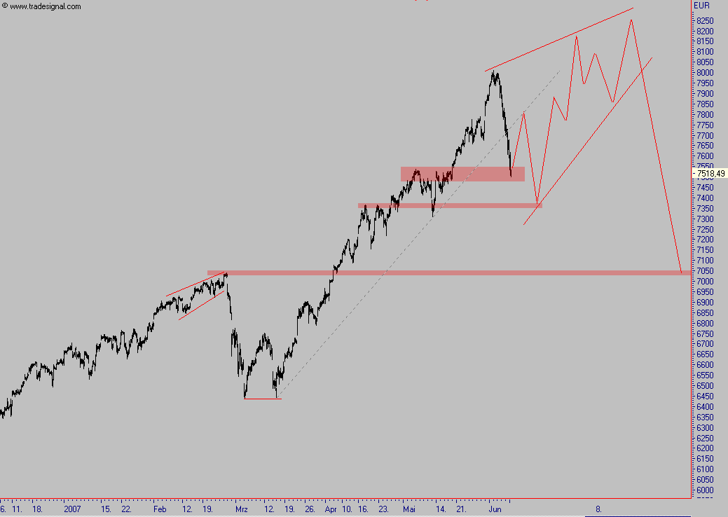 mögliche Variante ganz ohne Indikatoren von mir, Der Markt ist kurzfristig stark überverkauft, bis hin zum Stundenchart und die sehr schnellen Indikatoren im daily, nichts desto trotz muß bei antizyklischer Handlungsweise strikt abgesichert werden in diesem dynamischen Markt. Zwischen 7480 und 7550 befinden sich recht starkes Widerstandscluster, so besteht eine gute Chance auf eine deutliche Gegenbewegung. Einen möglichen Verlauf habe ich unten im Chart dargestellt