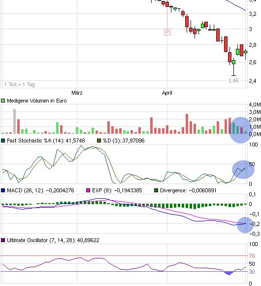 Die 38-Tagelinie ist angekratzt und auch die anderen Signale bis auf den MACD zeigen