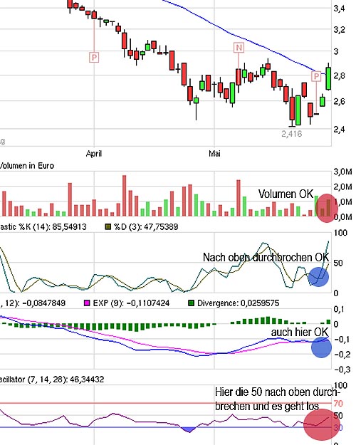 Weder das Volumen ist gestigen noch hat der MACD die Linie nach oben durchgrochen und der Ultimate Oscillator die 50 überstiegen.