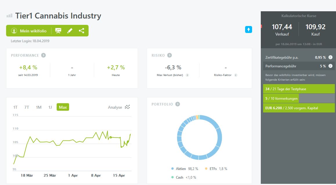 neue Wikifolio werden nur ins Portoflio aufgenommen, wenn es sich um reine Cannabis Wikifolio handelt; d.h. es dürfen vom jeweiligen Trader, im jeweiligen Wikifolio ausschliesslich Cannabis,Hanf,CBD oder im weitesten Sinne mit der Cannabis-Branche verbunde Unternehmen/TItel im Wikifolio gehandelt u./od. eingebucht sein. Pharmawerte eingeschlossen, sofern ein Bezug auf Patente,Studien,Medikamente o.ä. gewährt ist. ((****ZULASSUNG BEANTRAGT**** per heute 26.04.2019))