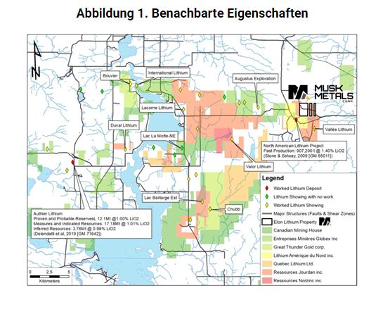 12. APRIL 2021, VANCOUVER, BC - Musk Metals Corp. („Musk Metals“ oder das „Unternehmen“) (CSE: MUSK) (OTC: EMSKF) (FSE: 1I30) gibt bekannt, dass Prospectair Geosurveys Inc. („Prospectair“), um eine hochauflösende Heliborne-Magnetuntersuchung auf seinem 100% igen Lithium-Grundstück „Elon“ durchzuführen. Die Umfrage umfasst mehr als 245 Hektar in den Townships La Corne und Fiedmont in Quebec, etwa 40 Kilometer nördlich der Bergbaustadt Val d'Or. Die Liegenschaft liegt strategisch günstig etwa 600 Meter nordöstlich des Projekts Lithium Amérique du Nord („Nordamerika“) (ehemals Mine Québec Lithium), das von 1955 bis 1965 über 907.000 Tonnen Material mit 1,40% Li2O produzierte (Boily et al., 1989).