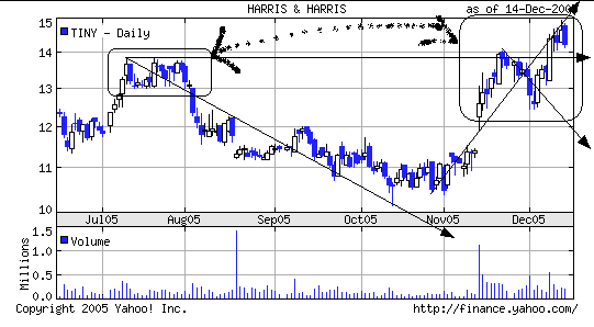 Halte von Chartanalyse aber nur begrenzt was (v.a. bei so kleine Titel noch weniger) - wie schon mal gesagt : Man nehme einen fetten Stift und verbinde die einem lieben Punkte, und siehe da alles wird gut!!! v.a. würde dein Chart doch eher suggerieren, dass Tiny ausgebrochen ist und ein Kaufsignal gegeben wurde, da die 14 ja überwunden wurden?