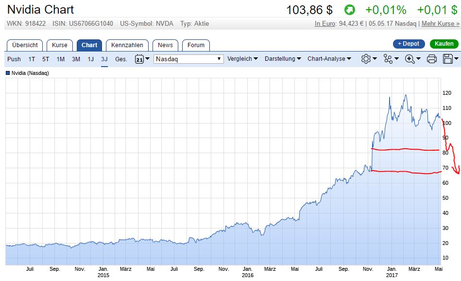 Um 20 Aktien zu 95 Euro nachgelegt, glaube an das Unternehmen und denke das man hier etwas solides hat. Bei Facebook, Netflix und Snapchat bin ich da eher skeptisch, ob da wirklich Werte dahinterstecken. N Vidia ist Marktführer in ihrem Berreich, geht vom Gameing-Segment in mehr gewinnverspechende Bereiche. Wobei wir auch beim Gameing in den nächsten Jahren Zuwächse erwarten werden, vor allem mit neuen Techologien wie VR/AR, die starke Prozessoren vorrausetzen. Auf der anderen Seite haben wir die schwächelnde Konkurrenz AMD, die vor allem finanzielle Probleme hat. Die Generation, die mit PC Spielen nix mehr anfangen kann, stirbt aus...Ich bin durch die neuen Partnerschaften mit Bosch, Daimler /Tesla etc, sehr überzeugt. Hier ist richtig Geld zu verdiehnen.