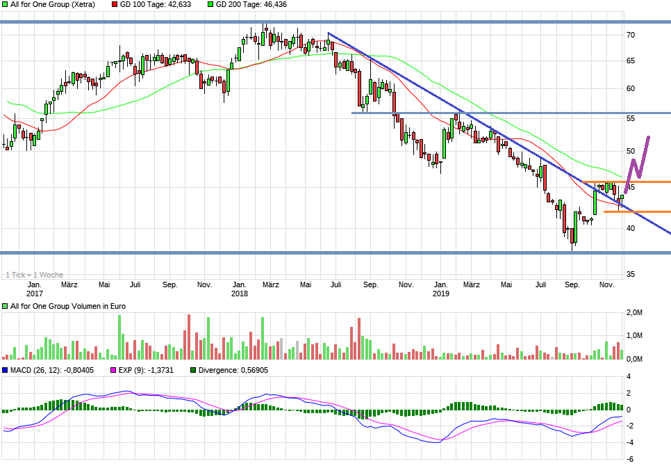 Kleiner Wehrmutstropfen ist für mich, dass man beim Ausblick letztlich das ansagt, was man schon 2017/18 erreicht hatte. Aber gut, man ist halt noch mitten in dieser Umbauphase. Ich hoffe, man geht jetzt die Marge richtig an. Und dann sollte A4O eigentlich auch wieder wie die Peergroup bewertet werden, also 70-90% höher auf Basis des Ausblicks 2019/20. Die 41-42 sollten damit jedenfalls auf alle Fälle halten. Geht's über 46 €, ist der Weg nach oben bis erstmal 56 € frei.