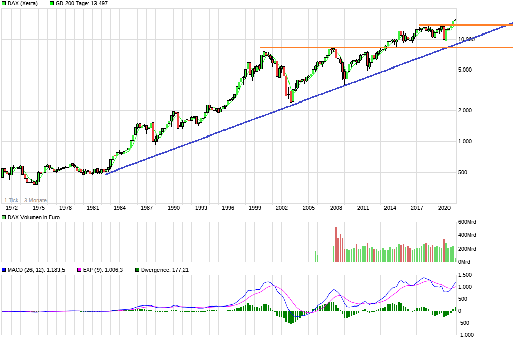 Also es kann durchaus sein, dass wir gerade erst am Beginn einer Mega-Rallye stehen, zumindest aber ähnlich wie 2013 mittendrin sind, nachdem die alten Doppelhochs überwunden wurden. 2013 war es der Bereich bei 8200, der nach vielen Jahren Konsolidierung überboten wurde, nun ist es der bereich bei 13800, der nach 5-6 Jahren Seitwärtsphase überboten wurde.
