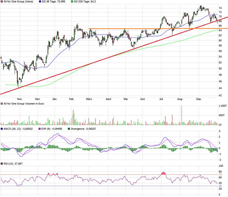 hmmm, Aufwärtstrend ist jetzt leicht gebrochen. Kann aber noch Fehlsignal sein, wenn es jetzt wieder hoch drehen würde. Unten sollte dann bei 64,2 und 64,8 € ne Unterstützung aus 200TL und alten Verlaufshoch liegen.