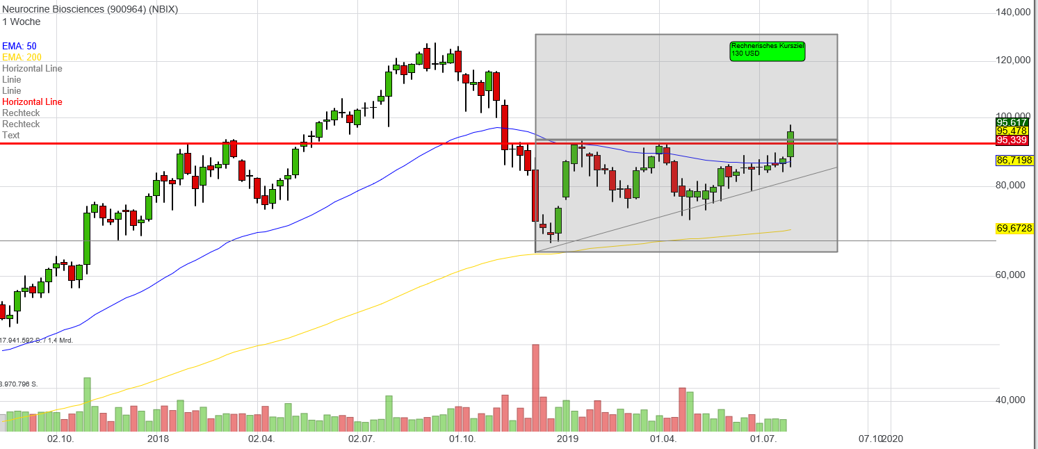 Nachdem die extrem unterbewertete Celgene leider von Bristol-Myers übernommen wurde, habe ich mich in dem Sektor nach neuen aussichtsreichen Werten umgeschaut. Neurocrine hat dabei einen bleibenden Eindruck hinterlassen und ich sehe bei der Aktie ein sehr gutes Chance-Risiko Verhältnis aus folgenden Gründen: