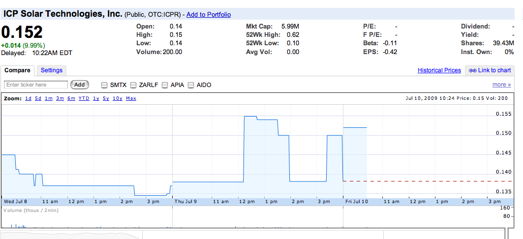 News --- ICP Solar Technologi­es Inc. (OTCBB: ICPR | Quote | Chart | News | PowerRatin­g) opened Tuesday at $0.15 per share on trading volume of 191,028 shares.