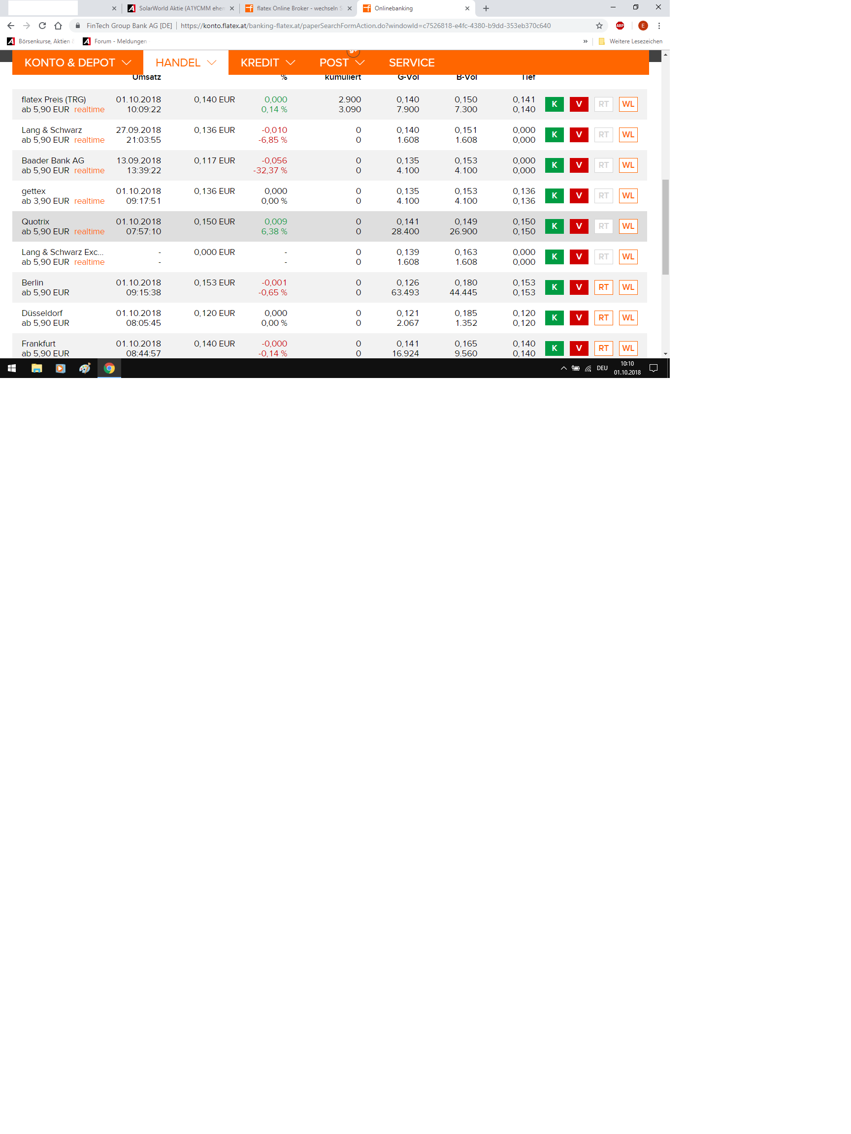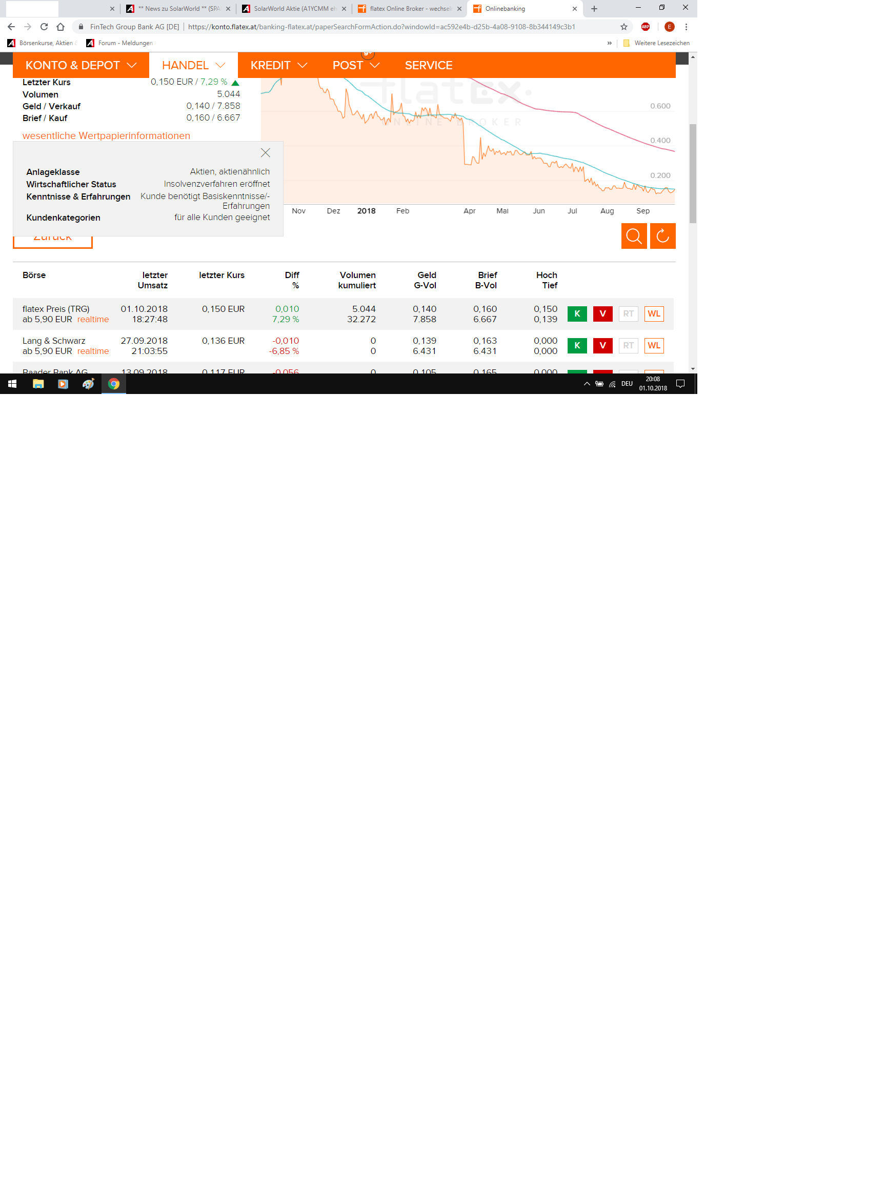 und wegen flatex: bist du privatanleger? dann müsste bei orderausführung in deinem deutschen depot ein hinweis erscheinen, dass der kauf von solarworld nicht erlaubt ist - wegen verbraucherschutzbestimmungen seit 2017 oder so...