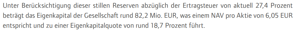 Die Zahlen sind tatsächlich nicht schlecht. NAV pro Aktie: €6,05 (s. angehängte Grafik), das ist das 8,3-fache des aktuellen SAktienkurses von €0,73 +0,0075 +1,04 % L&S. 14:26:22