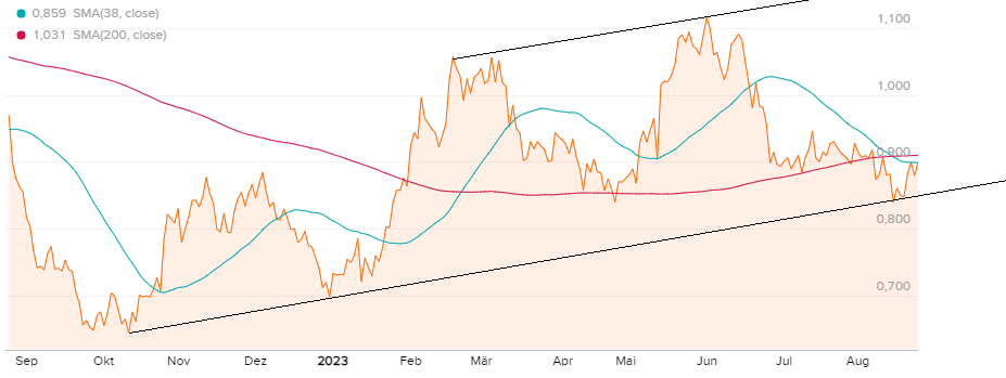 Der Kurs in NOK läuft bis zum unteren Ende des Aufwärtstrendes, dann dreht er. So die Hauptthese. Sollte der Trend nach unten durchbrochen werden steht eine längere Konsolidierung uns Haus.