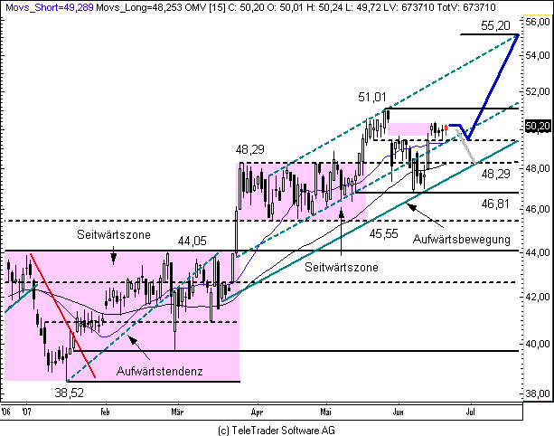 Charttechnischer Ausblick: Durchbricht die OMV - Aktie den Bereich zwischen 49,66 und 50,87 Euro signifikant, dann wäre eine weitere Rallye bis 60,98 Euro möglich. Fällt sie aber wieder per Wochenschlusskurs unter 49,66 Euro zurück, müsste mit einer Abwärtsbewegung bis an den Aufwärtstrend seit September 2006 bei aktuell 43,31 Euro gerechnet werden.