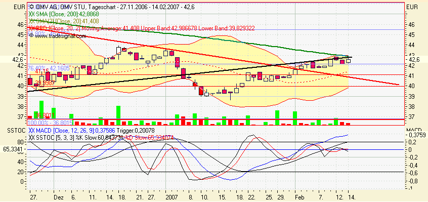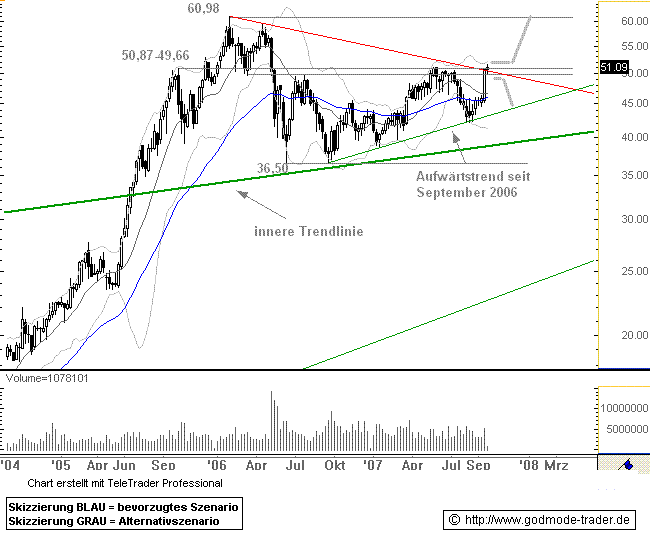 Rückblick: Nach ihrem Allzeithoch aus dem Februar 2006 bei 60,98 Euro fiel die OMV - Aktie stark zurück. Erst bei 36,50 Euro stabilisierte sich die Aktie auf einer langfristigen inneren Trendlinie. Danach zog die Aktie mehrmals bis an den Widerstandsbereich 50,87-49,66 Euro an. Aktuell notiert sie wieder an diesem Bereich. Zudem verläuft hier nun de Abwärtstrend seit Februar 2006. Aktuell notiert die Aktie leicht über diesem Bereich, was aber bisher nicht als signifikanter Ausbruch angesehen werden kann.