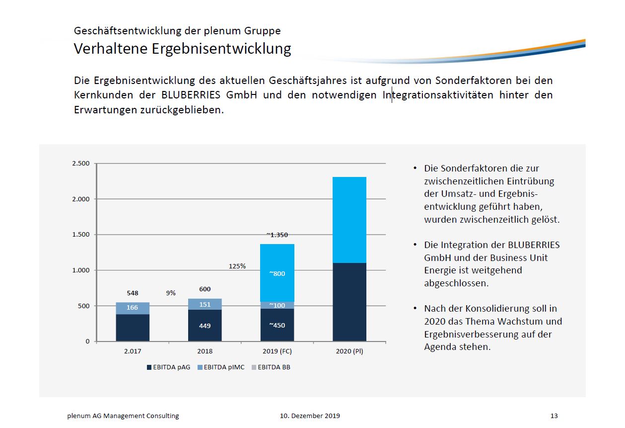 Was das KGV angeht ... Man kann grundsätzlich bei fast allen Aktien mit dem KGV argumentieren, und explizit auch bei Plenum. Die Frage ist nur, wie stark Umsätze und Gewinne steigen und daher das KGV relativieren.