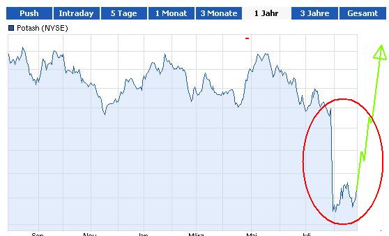 Seltene Erden , Lithium und auch Graphite sind mittlerweile wieder auf dem Boden gelandet. Da muß doch wieder etwas Neues her. Wie wäre es dieses Mal mit Potash? Bei uns sind die Ländereien landauf und landab bereits mit Energiemais zugepflastert. Der Boom bei den Energiebauern verstärkt sich noch immer und da wird viel Dünger benötigt. In den USA wird man wegen der hohen Ernteausfälle mit viel Dünger nachhelfen müssen, um die ausgefallenen Erträge für die Zukunft ersetzen zu können. Also sollte man dieses Mal bei der Ersten dabei sein!