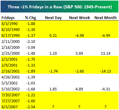 Below we highlight the prior 4 times it occurred. As shown, the first didn't happen until August 1990, and the market was down significantly the following week. It happened again in February 2000, and while the market bounced in the short term, we all know where it went from there. In February 2001 and May 2002, the S&P 500 again saw 3 straight Fridays of -1% or more, and while results were mixed over the following week, the following month was down quite a bit.