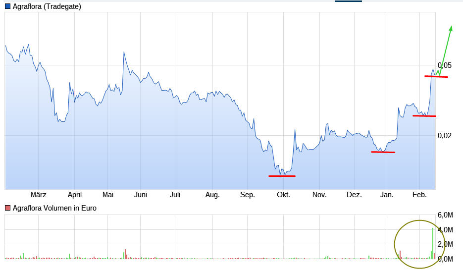 vor allem beachte man das Volumen der letzten Handelstage,hier ist was im Anmarsch.NEXT STOP 0,08,morgen früh wird das Volumen wieder anziehen.