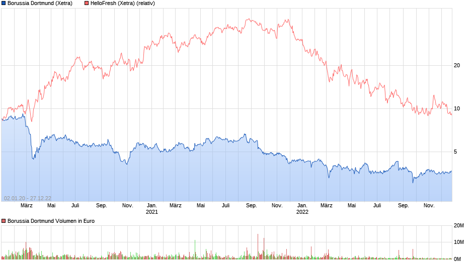 Wenn man die Performance der beiden Aktien über den Zeitraum der Coronakrise betrachtet, dann ist festzustellen, dass Hellofresh die Krise weitaus besser überstanden hat als z.B. Borussia Dortmund. Als Startpunkt habe ich den 1.Januar 2020 gewählt, als Endpunkt gestern, den 27.12.2022